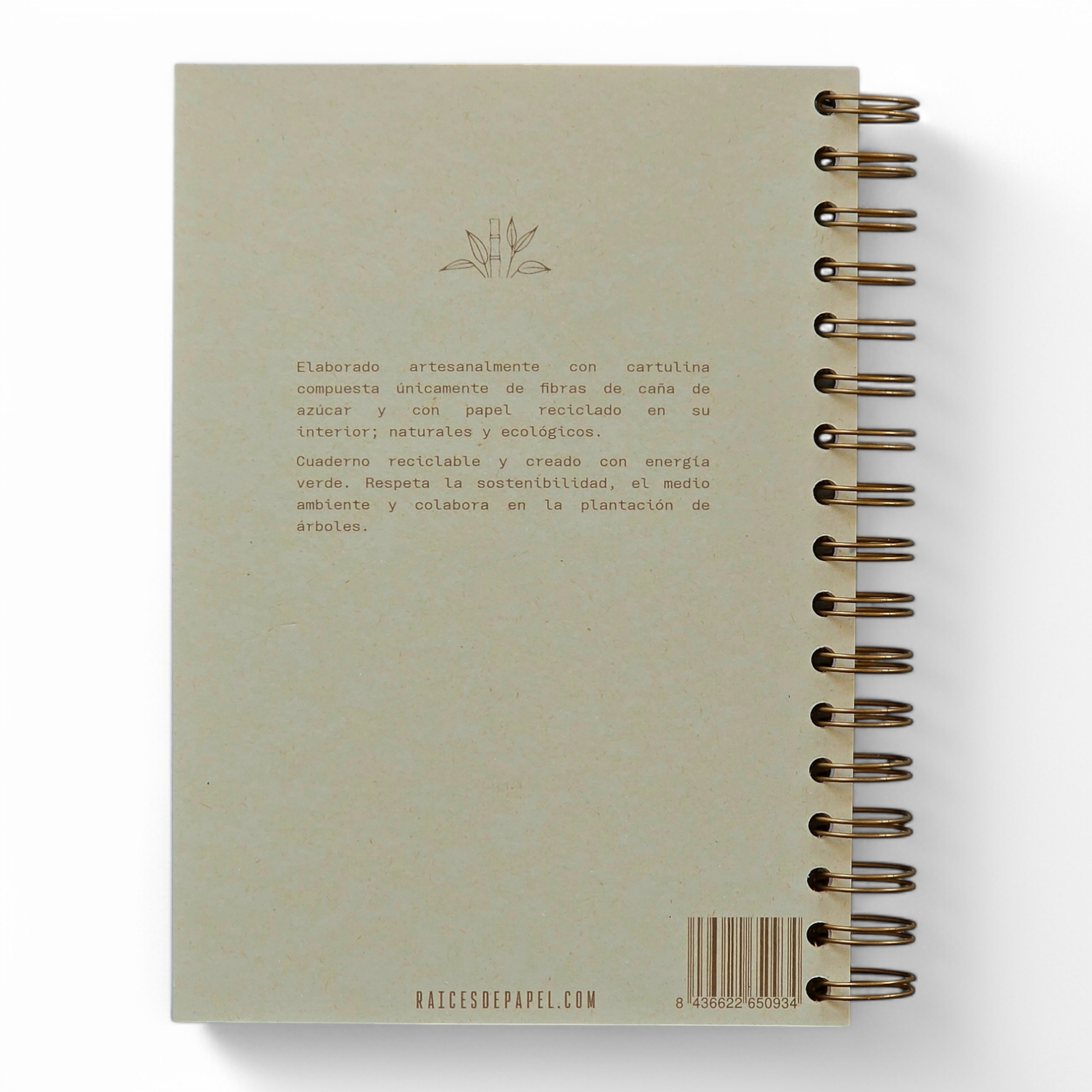 Tapa elaborada con fibras de caña de azúcar y papel reciclado en su interior. Impreso con tinta ecológica y fabricado con energía verde.